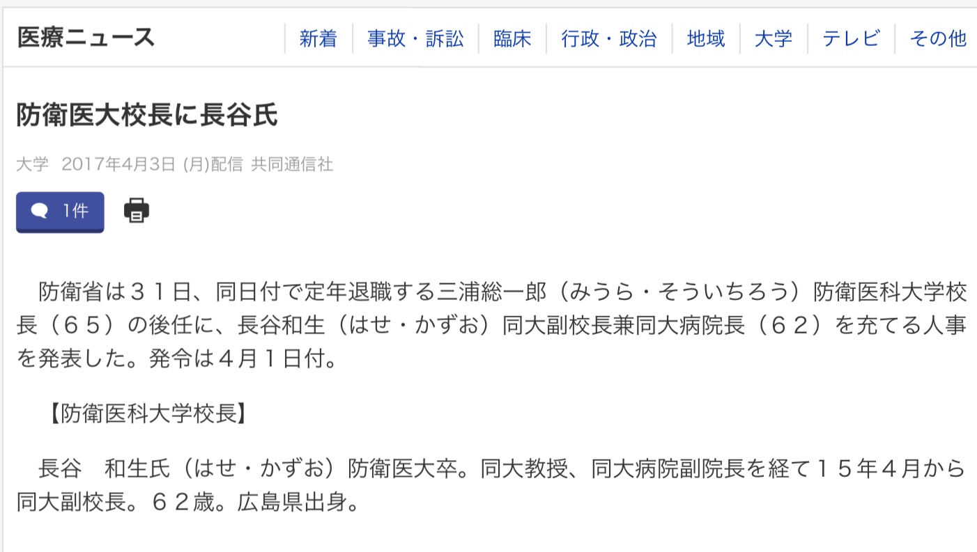 長谷君が防衛医科大学校の学校長に就任したという医療ニュース